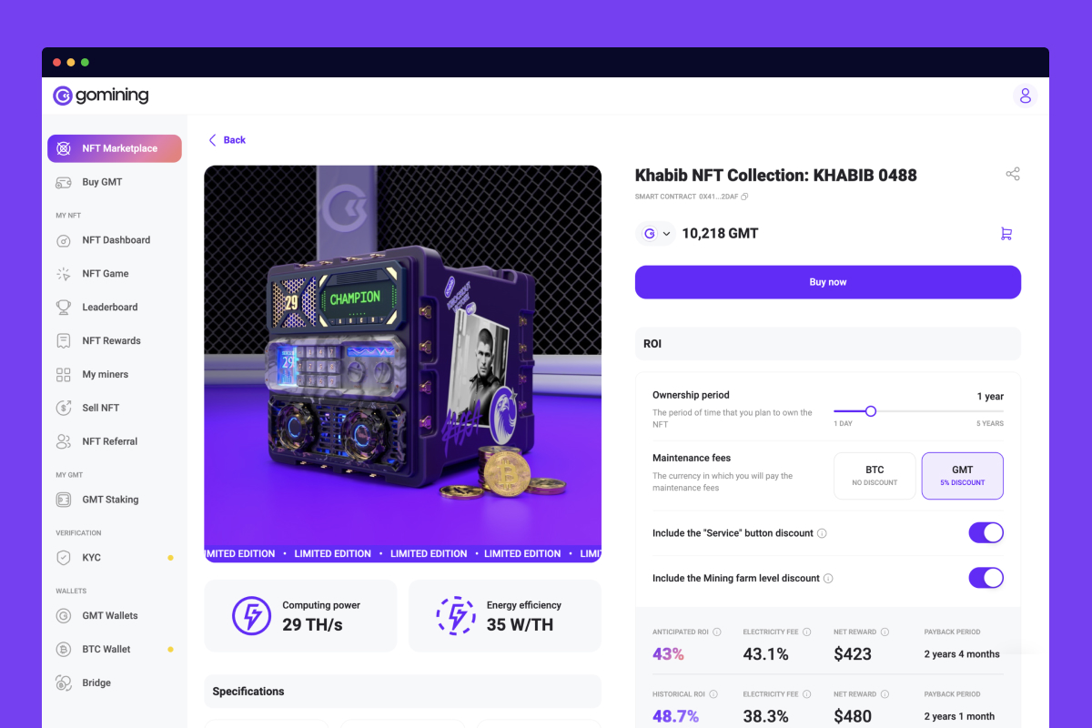 GoMining has received support from such notable public figures as undefeated MMA star Khabib Nurmagomedov. The champion has collaborated with the company on a special series of NFTs called the Khabib Collection. This unique collection features images designed with various items associated with Nurmagomedov’s career, such as quotes and other features related to the legend. All of the NFTs in the Khabib Collection are backed by a symbolic 29 TH/s, representing the same number of victories Khabib achieved during his illustrious MMA career.